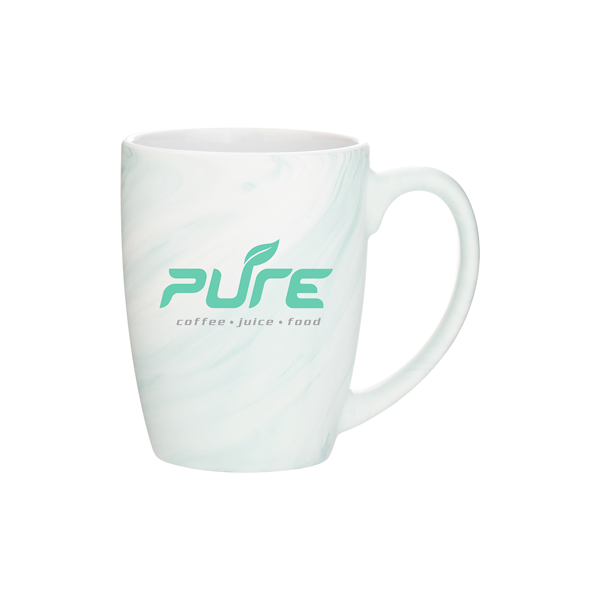 10 oz stoneware: matte color haze out / glossy white in. Hand wash recommended. Microwave safe with non-metallic imprint.