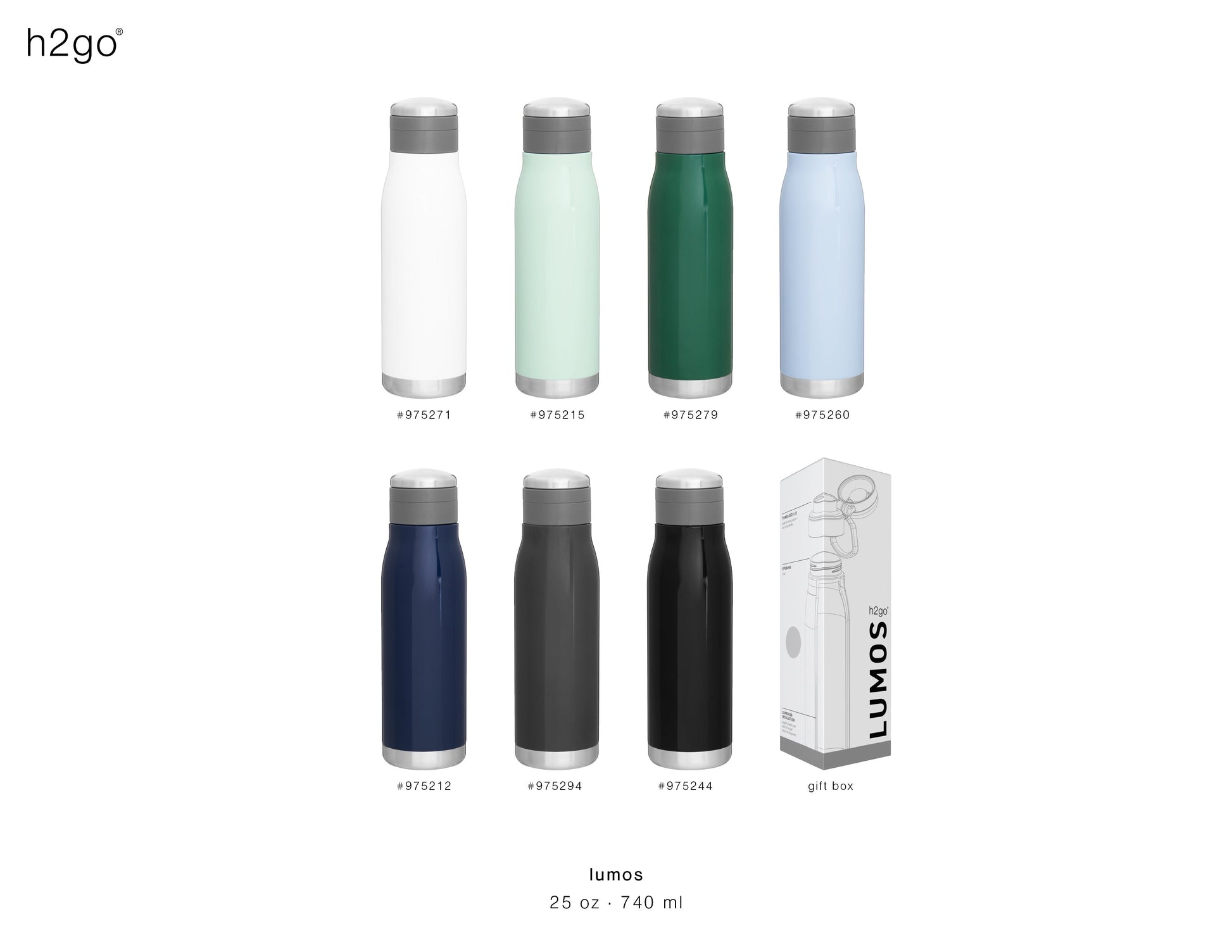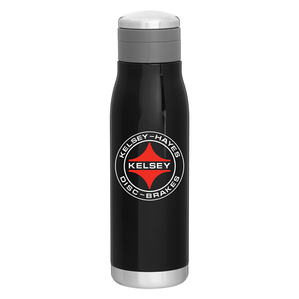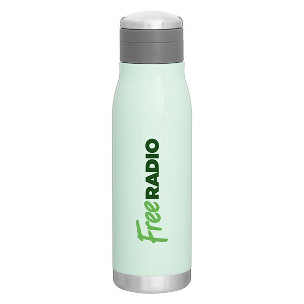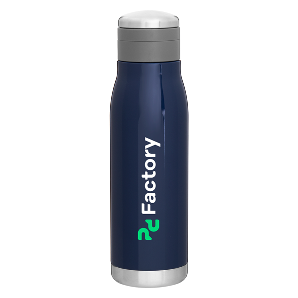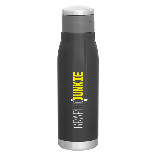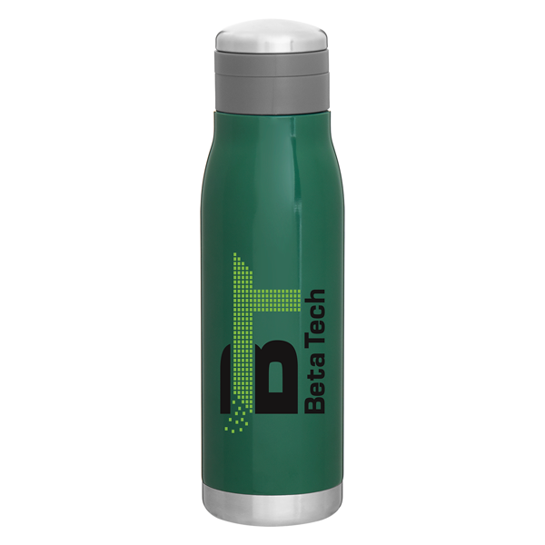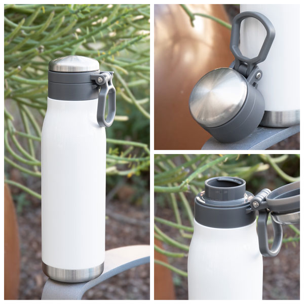 25 oz double wall 18/8 stainless steel thermal bottle with copper vacuum insulation, threaded dual-opening lid, wide drinking spout, carrying handle, and stainless steel base · gift box included