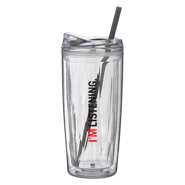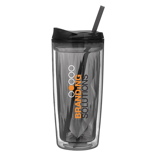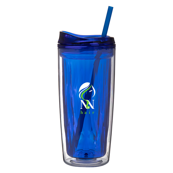16 oz double wall acrylic tumbler with clear outer wall, colored geometric inner wall, push-on dual-purpose swivel lid, and matching soft straw. patent #D732,889. Individual gift box. Hand wash recommended. Do not microwave.