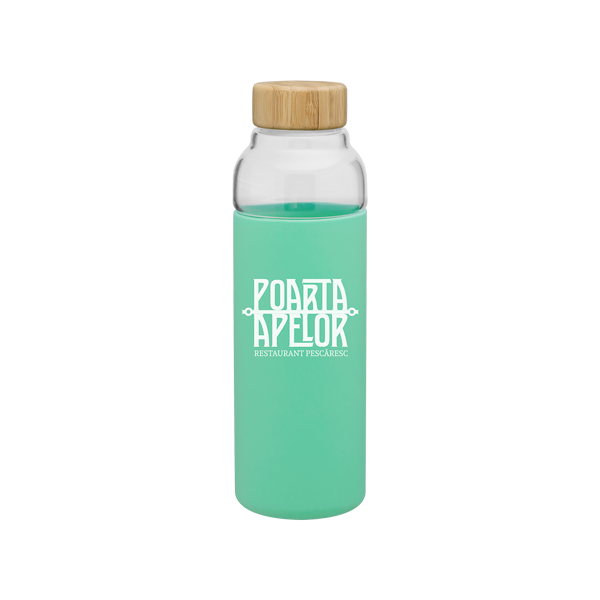18 oz single wall borosilicate glass bottle with threaded bamboo lid, and protective silicone sleeve. Individual gift box. Hand wash recommended. Microwave safe (without lid). 9" H x 2.875" W
