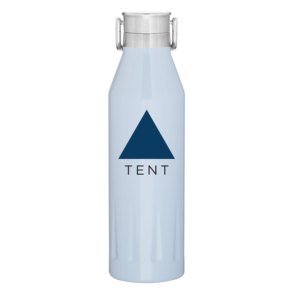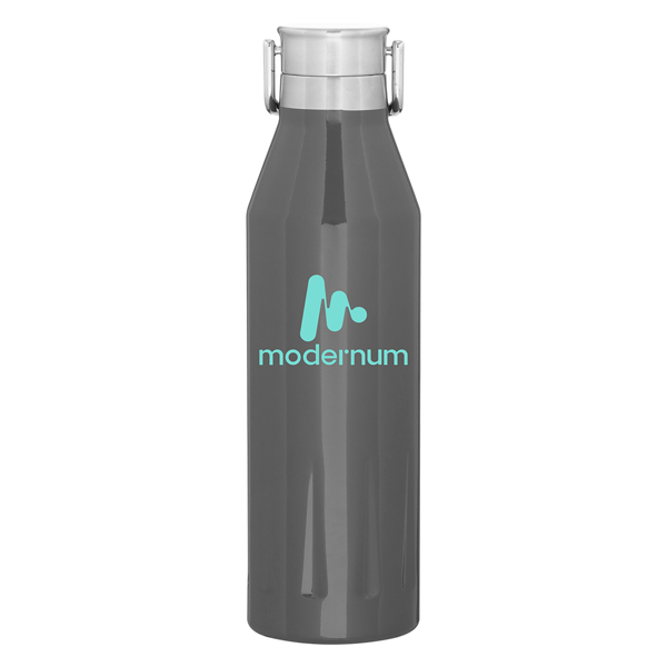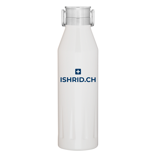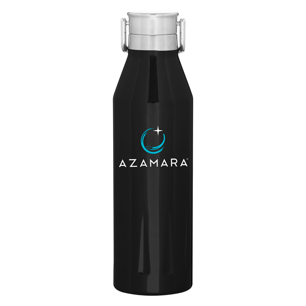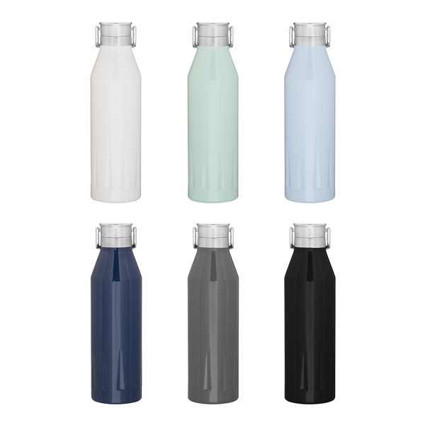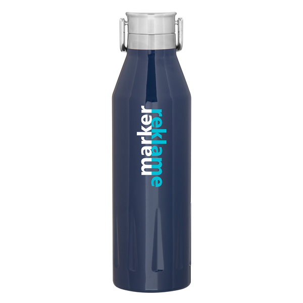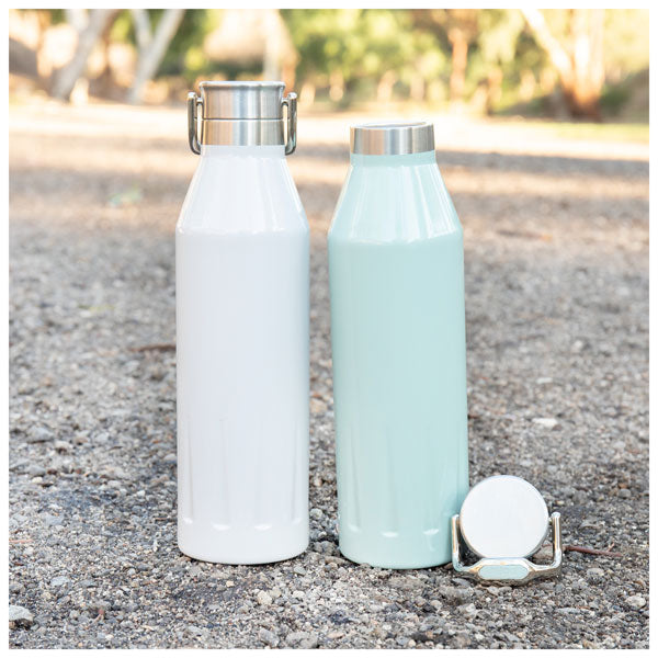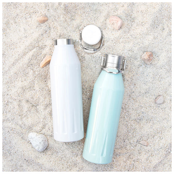 20.9 oz double wall 18/8 stainless steel thermal bottle with copper vacuum insulation, threaded insulated lid, carrying handle with silicone matching accent, and stainless steel rim · gift box included.