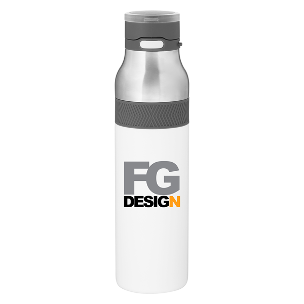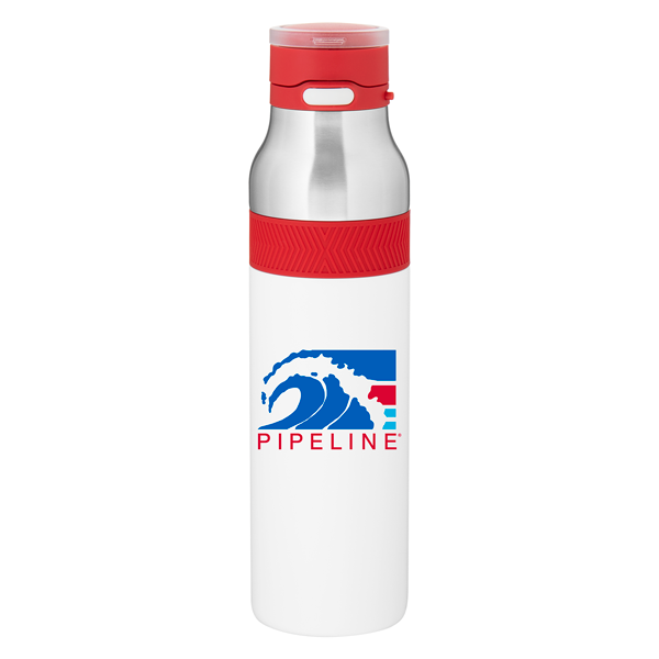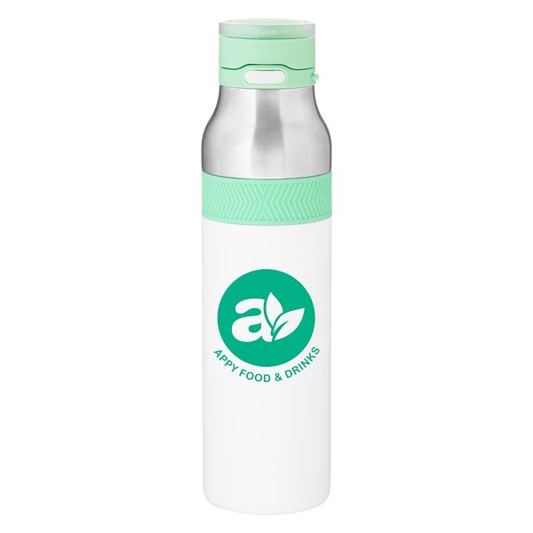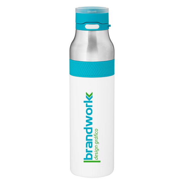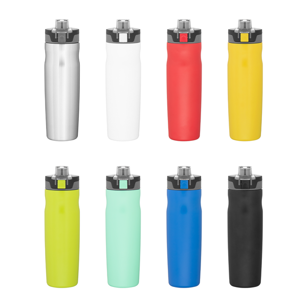 20.9 oz double wall 18/8 stainless steel thermal bottle with copper vacuum insulation, threaded one-touch push-button lid with locking mechanism, carrying handle, color accent, and powder coated finish · gift box included