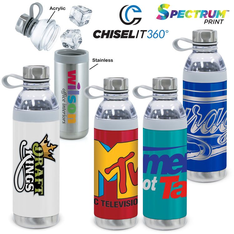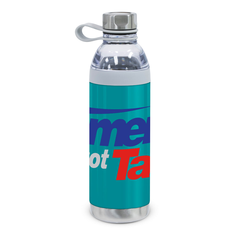 20 Oz. High gloss finish stainless steel body water bottle with AS plastic/stainless steel dual opening lid (for easy cleaning and adding ice cubes). Double wall insulated; copper lined; rubber carry handle. Not microwave safe; hand wash recommended.