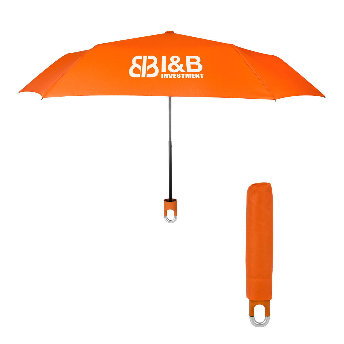 Manual Open. Telescopic Folding Umbrella. Metal Shaft. Matching Rubberized Handle With Magnetic Closure Carabiner. Matching Sleeve. Pongee Material. 10 ½" Folded.
