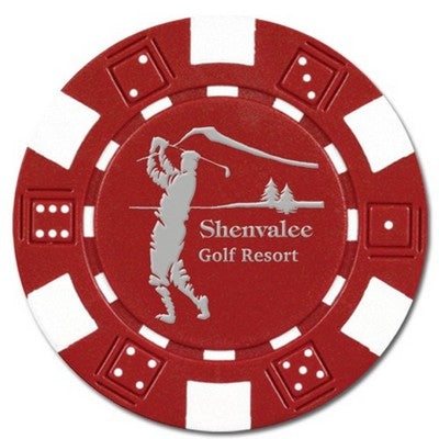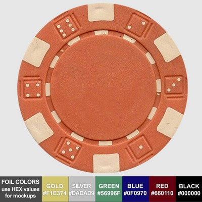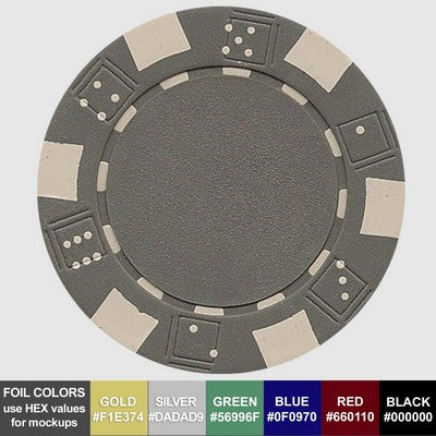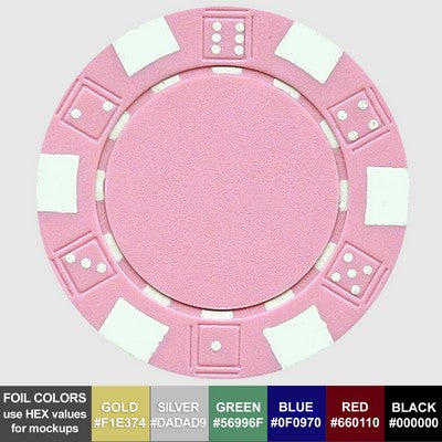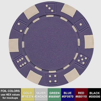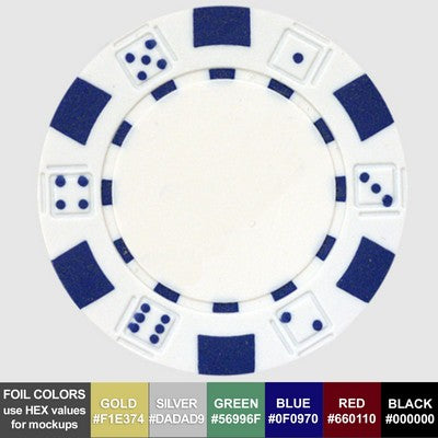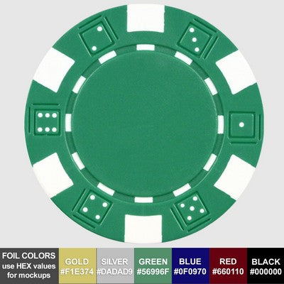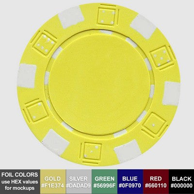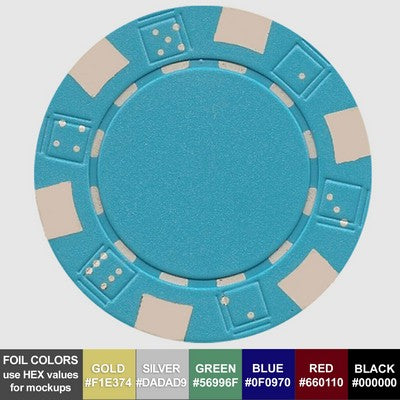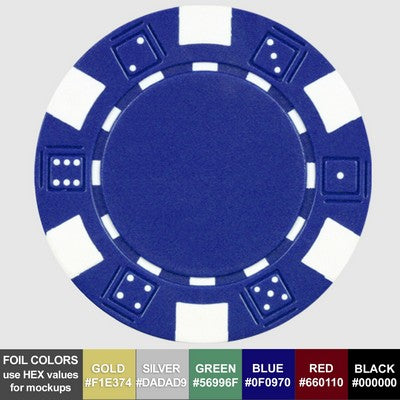 2-Tone 11.5 gram ABS dice striped poker chips with artwork permanently hot stamped in foil. These heavy Las Vegas style poker chips offer casino weight and feel at a low price. Perfect for all promotional purposes. Frequently used by companies to offer discounts on products or services, for fund raising purposes, as poker chip golf ball markers, wedding or executive gifts, or to promote new product and brands. Foil colors: Gold Metallic, Silver Metallic, Black, Red, Blue, Green.