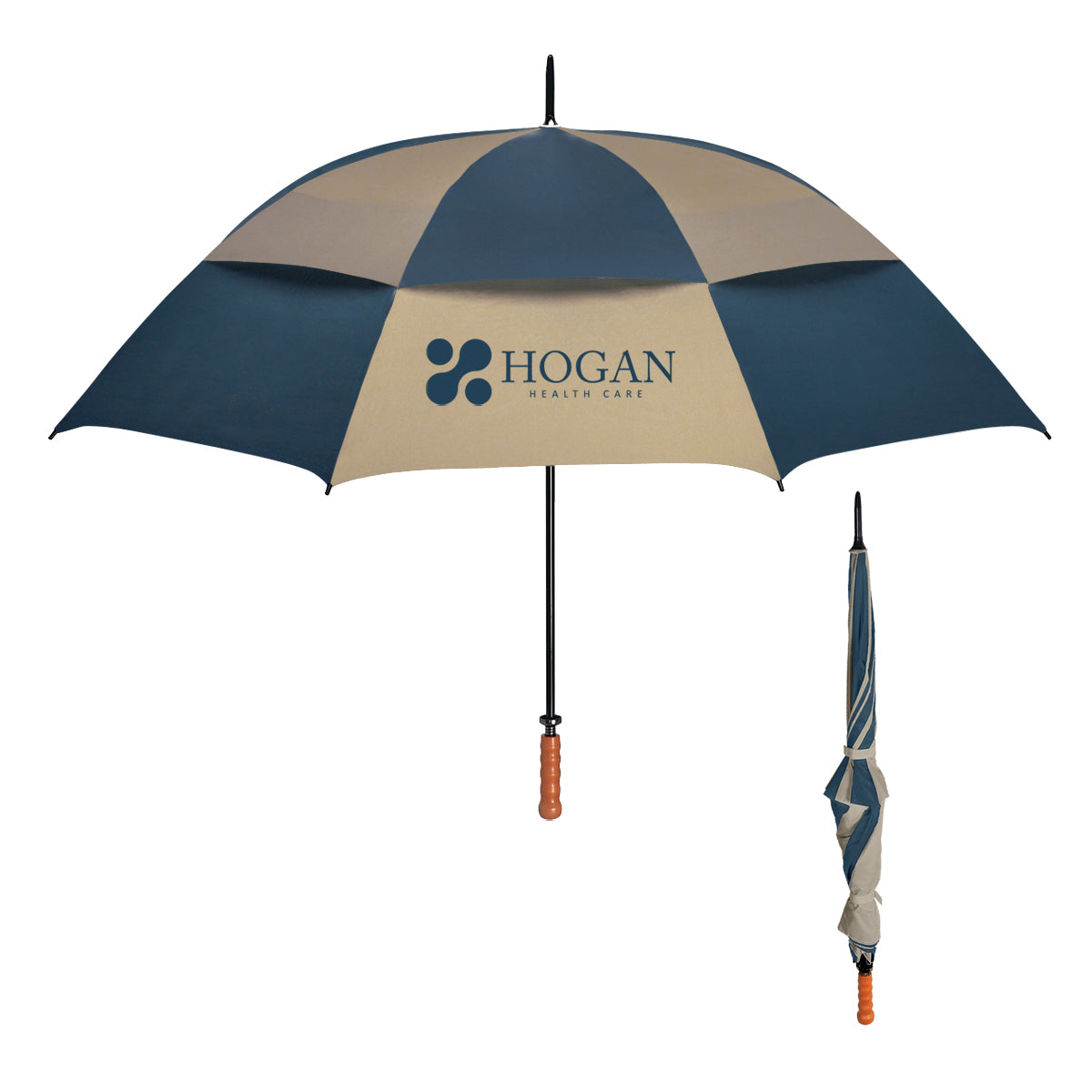 Manual Open. Classic Umbrella Design With Vented Windproof Canopy Construction. All Fiberglass Frame With Metal Shaft And Blonde Wood Grip Handle. Lightweight And Less Conducive To Lightning. Withstands Wind Gusts Up To 55 MPH. Nylon Material.