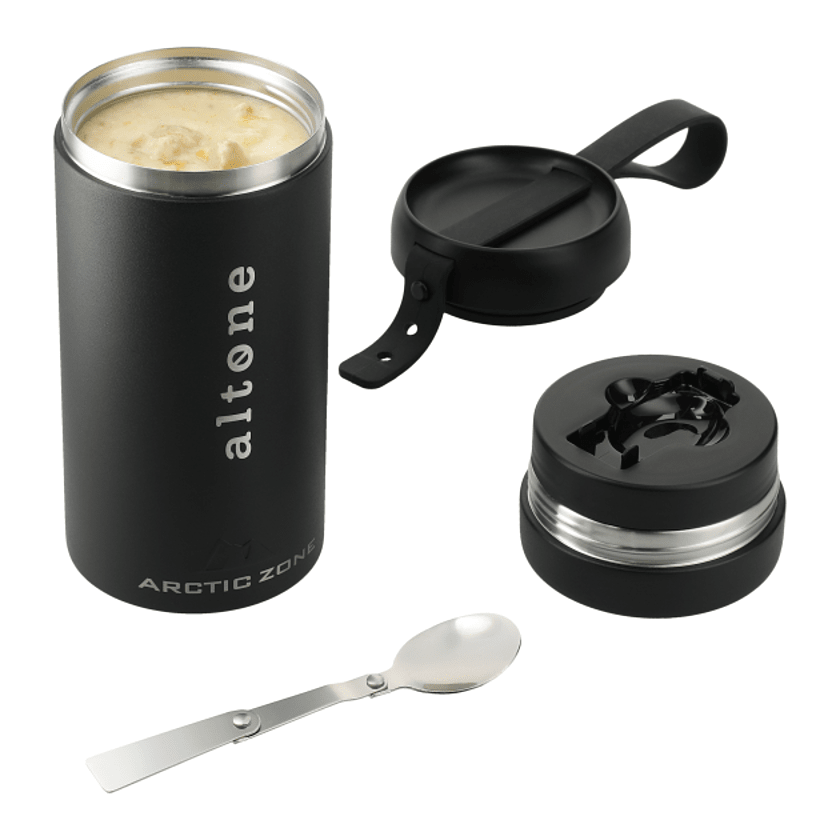 The innovative, on-trend Arctic Zone® Titan 20oz Meal Container is copper-insulated and holds 560ml, with a detachable snack storage space that holds an extra 150ml. It includes a foldable spoon that conveniently stores on the lid of the snack container. It also includes an adjustable silicone strap. Keeps food cold for up to 24 hours and hot for up to eight. 8.66" H x 3.74" W x 3.97" L