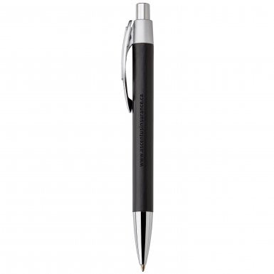 Bamboo and metal push-action pen with plastic trim. Trim made with 45% biodegradable materials.. For best imprint results, we recommend PMS 877 or white ink on colored finish and PMS 469 ink on natural finish.