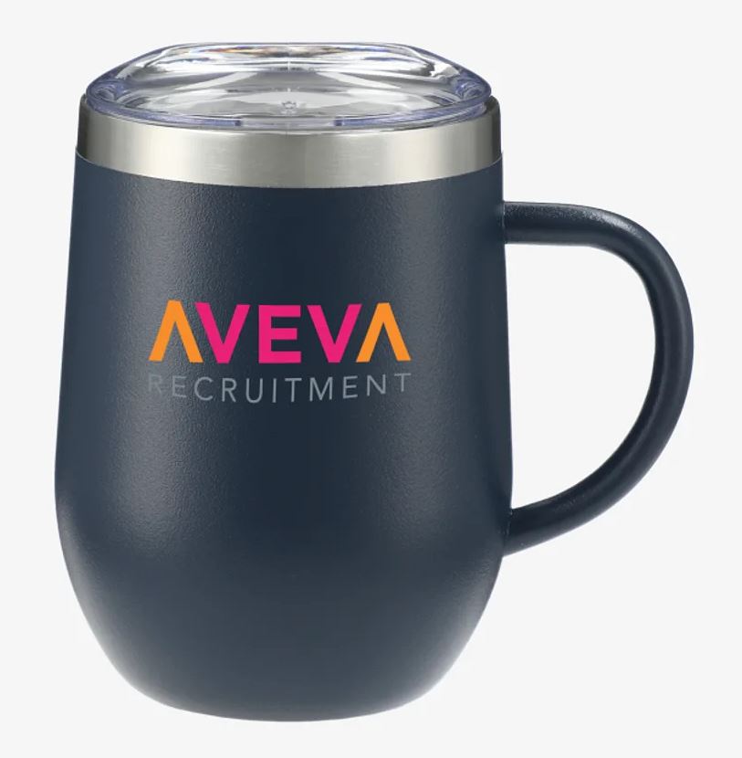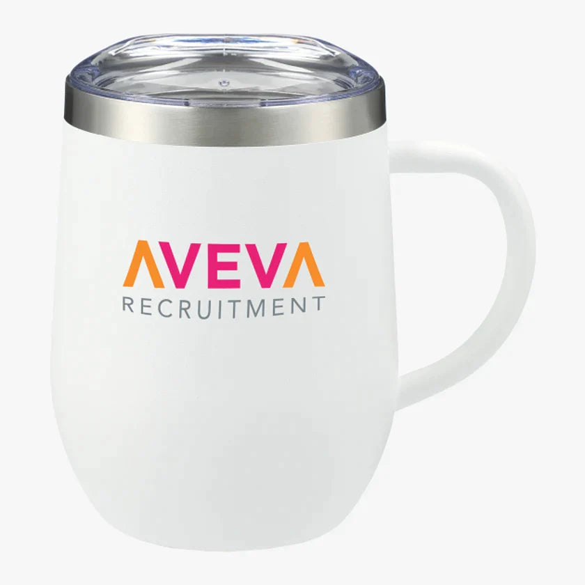 Durable, double-wall stainless steel vacuum construction with copper insulation, which allows your beverage to stay cold for 24 hours and hot for at least 6 hours. Features the durable stainless steel handle design. The construction also prevents condensation on the outside of the piece. On-trend, durable powder coating. 12oz.