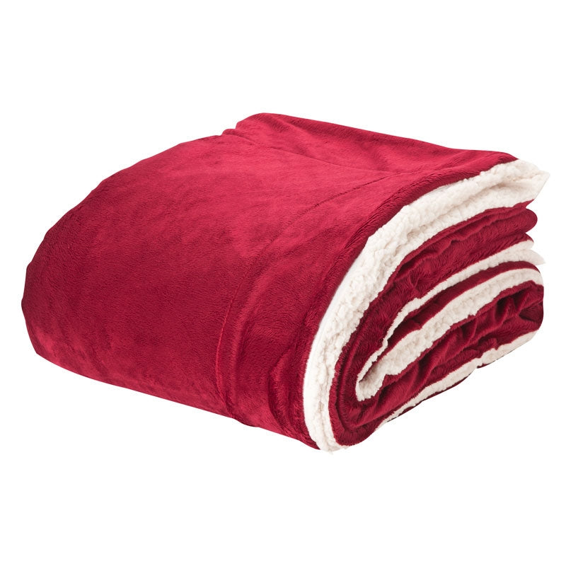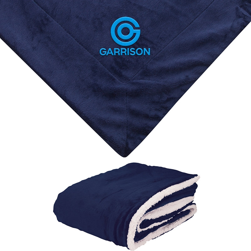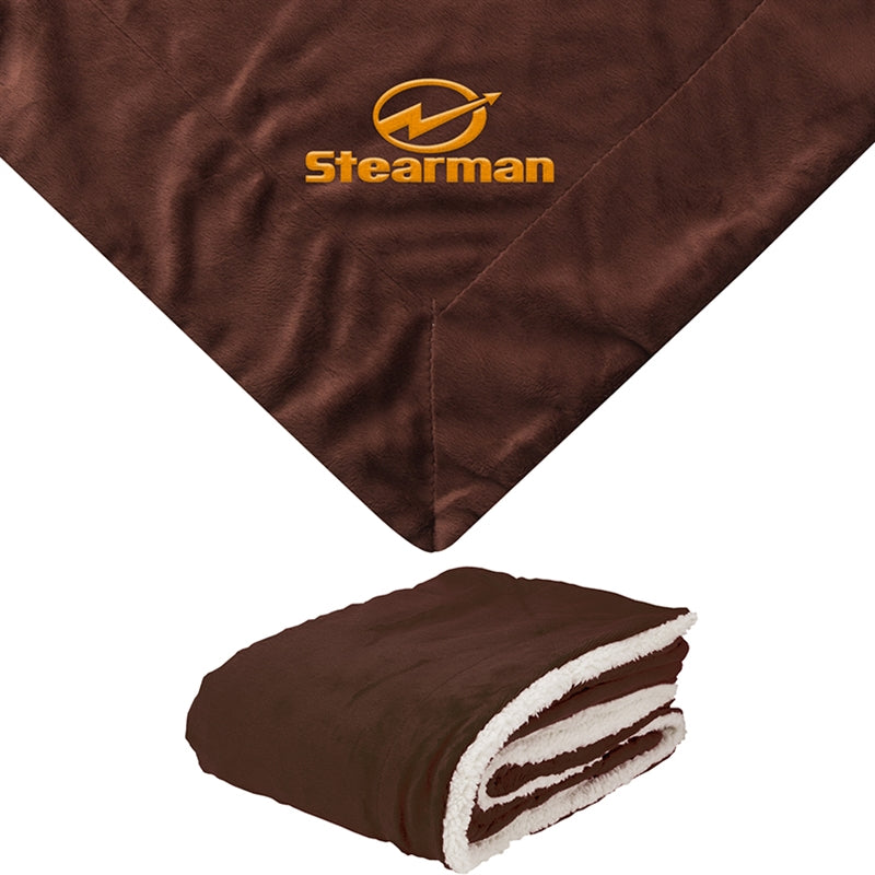 Luxurious ultra-plush fabric on one side and cozy imitation lambs wool on the other. Blanket size: 50" x 60". Vinyl bag with rope handle included.
