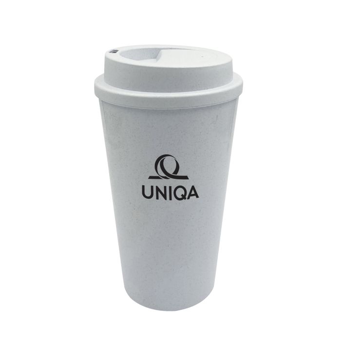 This 16 ounce tumbler is 50% bamboo fiber and comes with a matching lid.