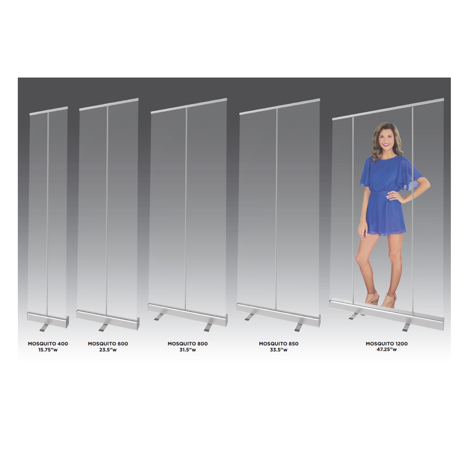 7mm thick, clear, rollable polyester Offered blank single-sided Easy to wipe clean and disinfect 3-piece bungee pole(s) Snap to graphic rail Silver base with black end caps and swivel feet Includes carry bag 600mm, 800mm, 850mm, 1200mm have standard height of 78.5″ 400mm has standard height of 62.5″ Quick and easy to assemble Production Time: 7 working days