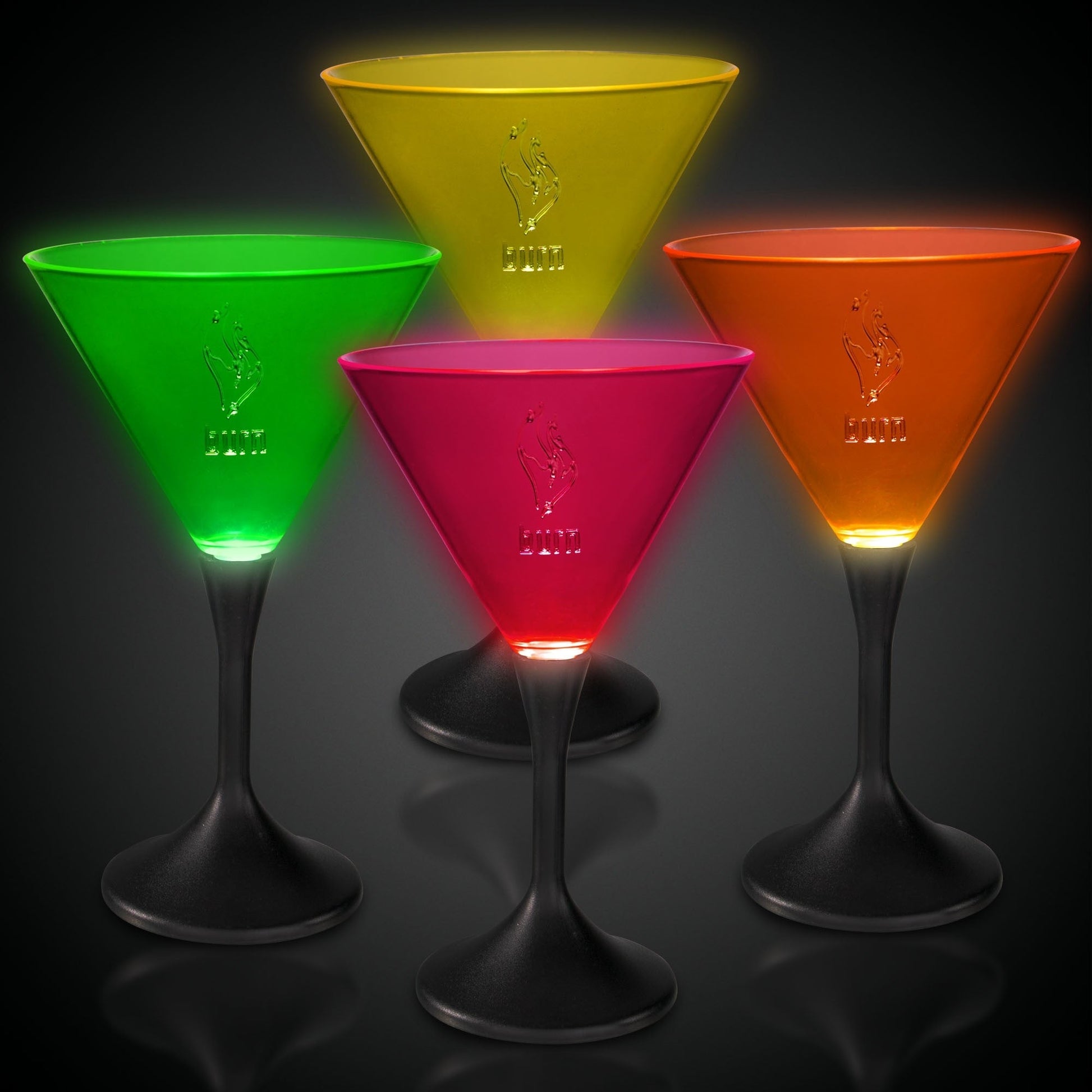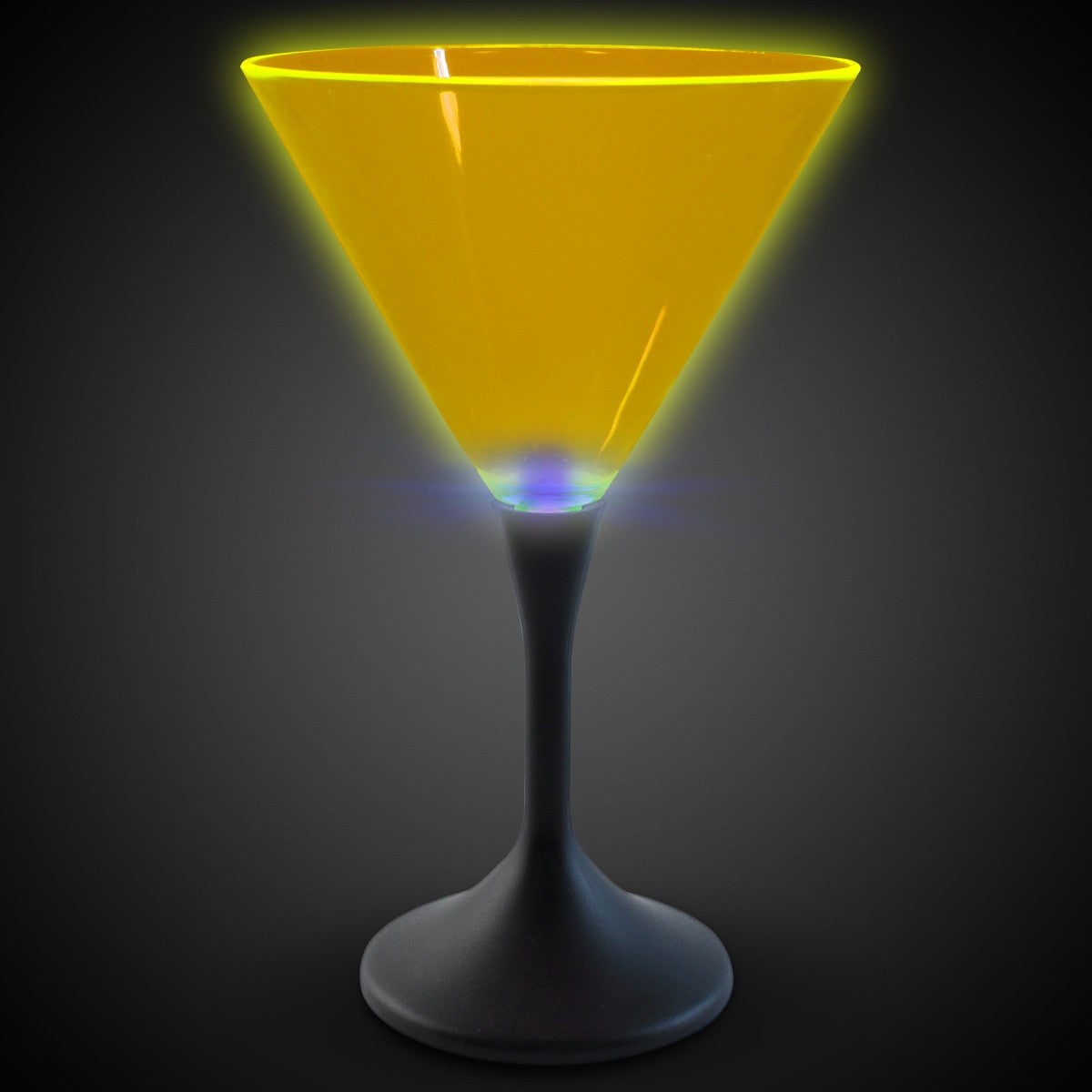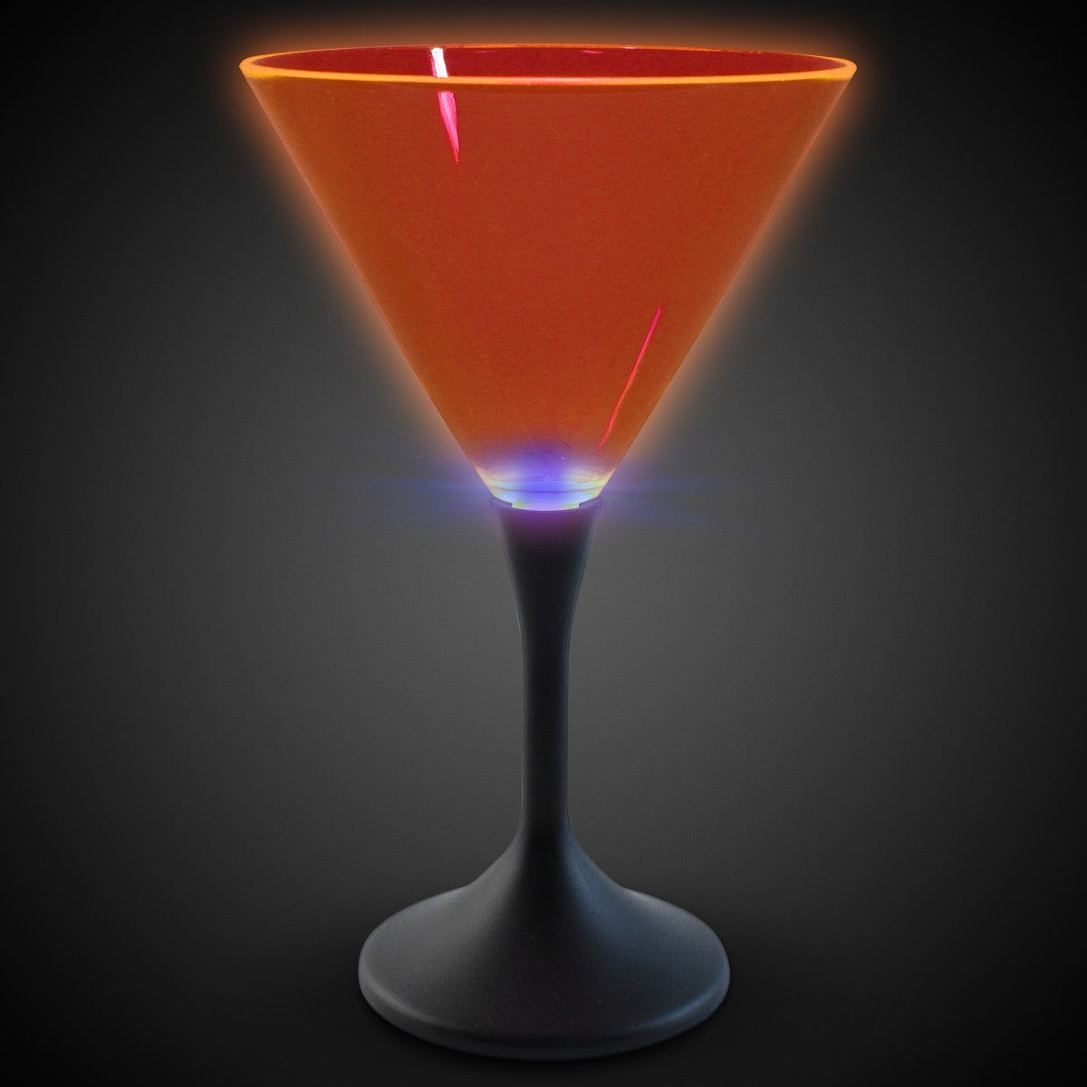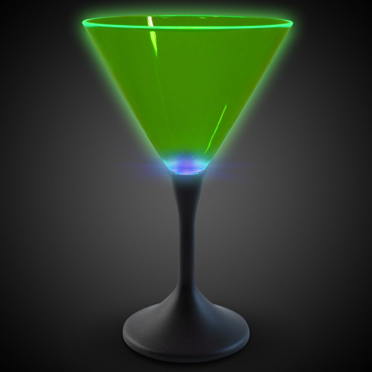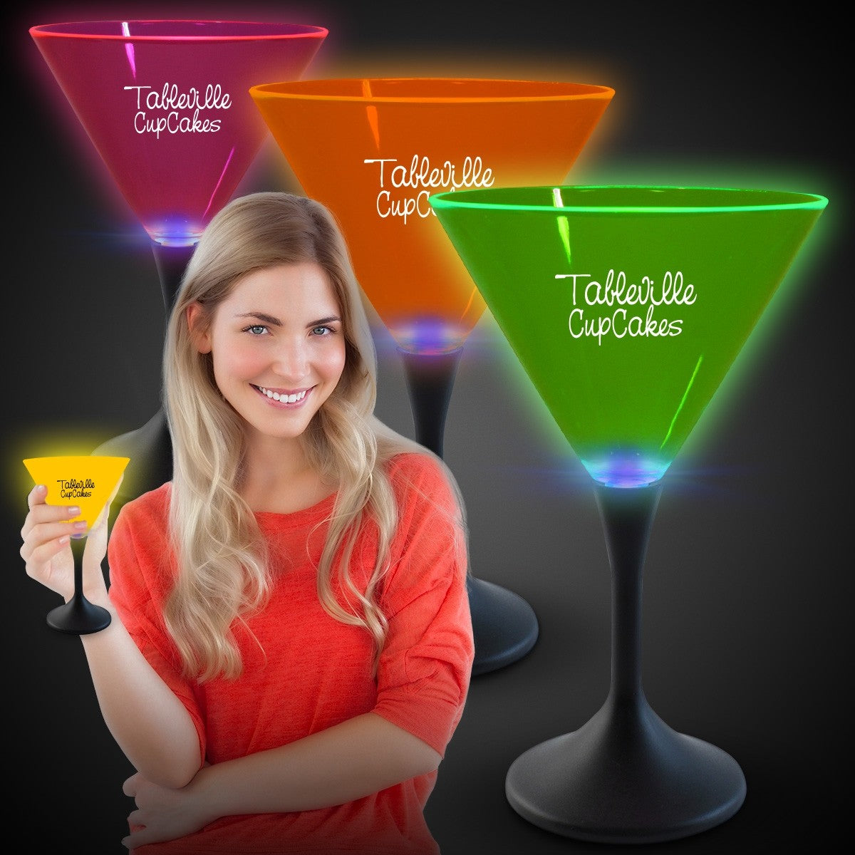 New style of Lighted Barware, this Martini Glass has 1 High Powered blue L.E.D. mounted up in the stem to concentrate the illumination into the glass (where the imprint resides). The black base and stem highlights the illumination effect.