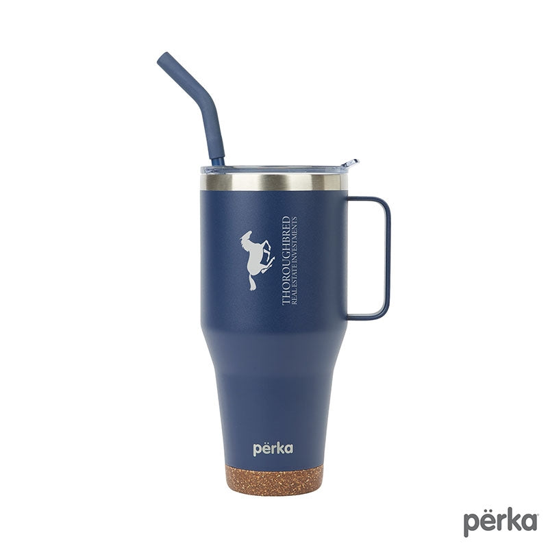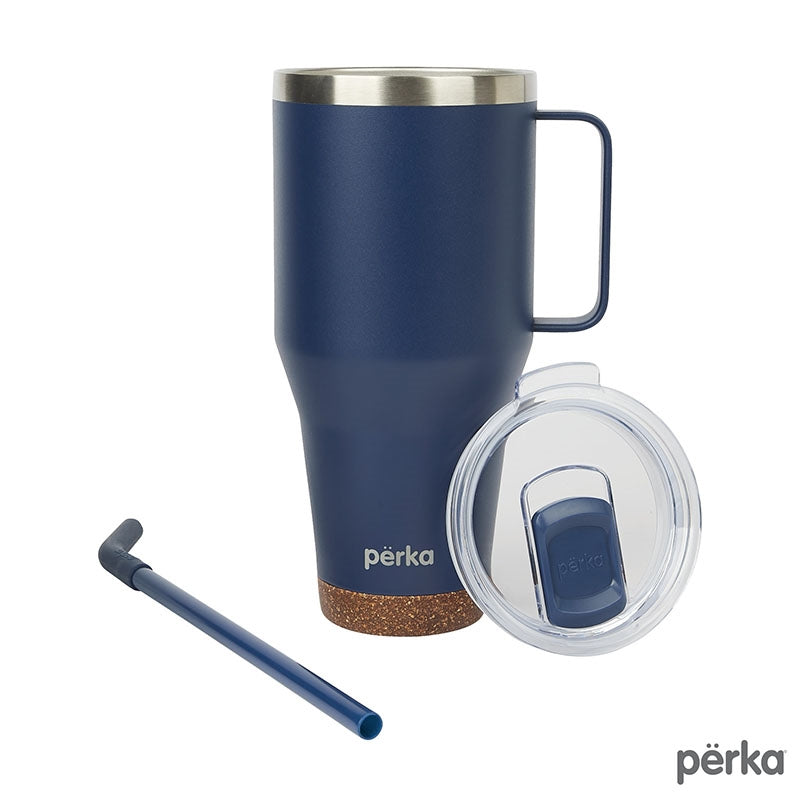 The Hartford 40 oz. Travel Mug offers generous all-day capacity and is constructed with double wall vacuum insulation to keep your favorite hot drinks hot for 12 hours and cold drinks cold for 24 hours. This reusable mug features a durable powder coated finish, 18/8 steel interior, an ergonomic shape that can fit into most standard car cup holders for easy traveling and its non-slip natural cork base provides extra protection for the mug and surfaces.