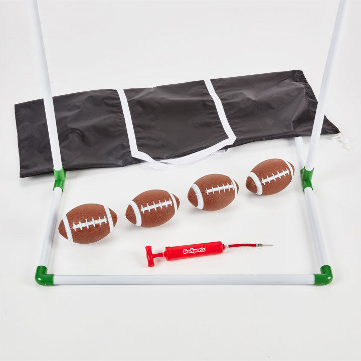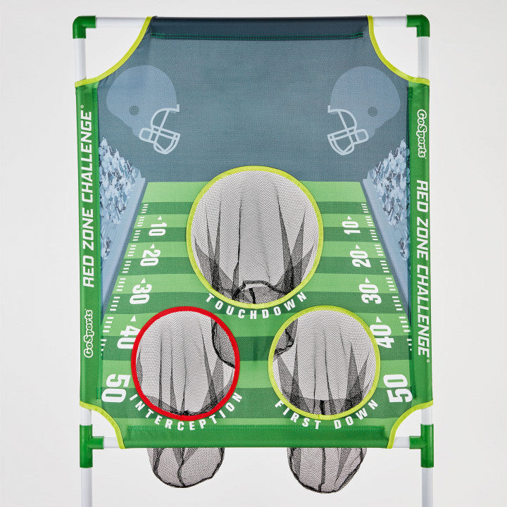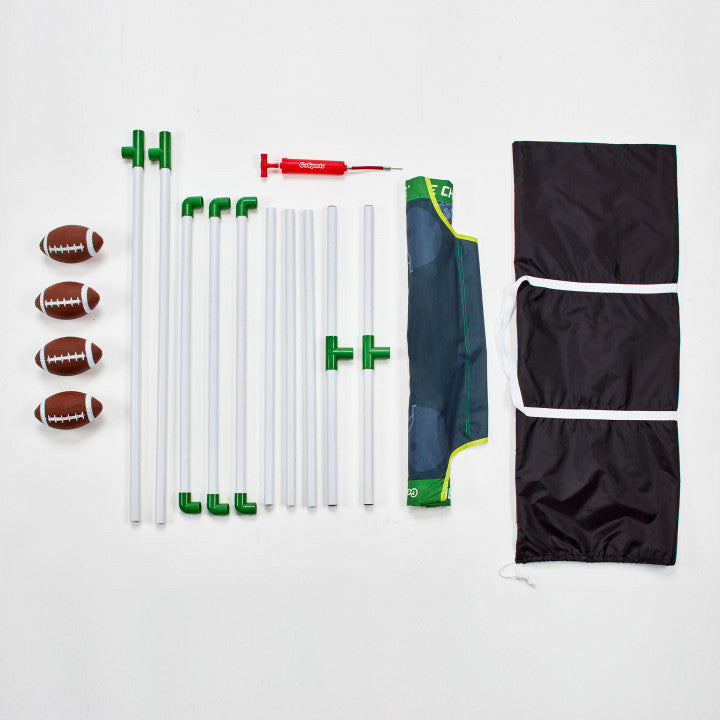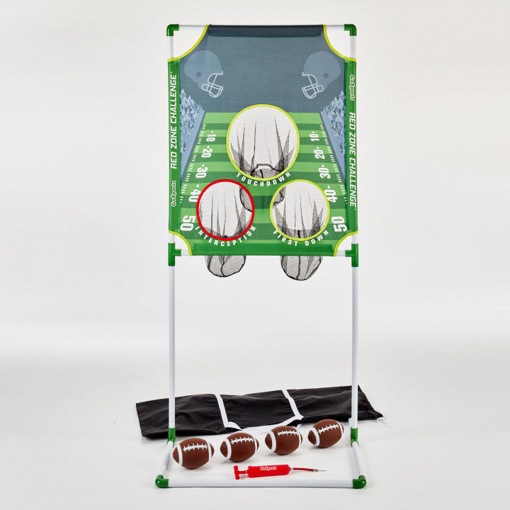 A brand new and exciting game for football fans of all ages! Full set includes: • 1 Red Zone Football Toss Challenge target • 4 Inflatable Footballs • 1 Ball Pump • 1 Portable Carry Case QUICK ASSEMBLY: Constructed from sturdy PVC the game assembles in less than 2 minutes and stores in the compact carrying case weighing under 15 pounds. Also features a weighted base and stakes so you can throw like the pros! Patented Product Dimensions: 67in h x 31in d x 30in l Includes 1 color logo 1 l. 30" L x 31" H x 67" D
