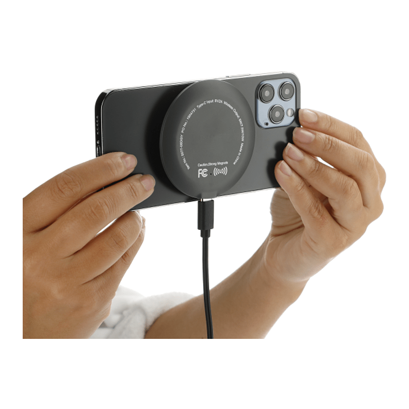 The Solekick™ MagClick™ Fast Wireless Charging Pad can be attached to iPhone 12/13/14 models magnetically for wireless charging. Supports three different wireless charging modes: 7.5W for All iPhone 8/X/11/12/13/14 Series;10W for Samsung Galaxy S9/S9 Plus/S8/S8 Plus/Note 8/9 and more, and 5W standard charging for all other enabled devices. Includes a 39-inch USB-A-to-Type-C charging cable. To achieve fast charging, a quick-charge power adapter (higher than 10W) is recommended (not included). Packaged in an FSC®-certified premium gift box.
