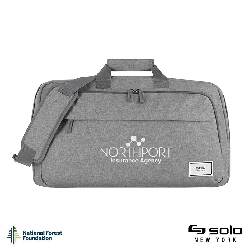 Gift the Solo® Re:move Duffel to your executives or new hires. From the Re:cycled Collection, this duffel has a beautiful heathered grey material created from 16 recycled PET bottles. You can use this duffel everyday at the gym or for quick weekend trips. It is easy to travel with as it has a back pocket that opens to slide over your luggage handle and 1 1/2" x 47" removable and adjustable shoulder strap. You can also carry this duffel with its carry handles that come with a hook and loop pad. Store smaller items in the small front zippered pocket or in the medium-sized compartment that has an organizer and a key fob. The main compartment has a mesh pocket and 2 slip pockets. This duffel comes with a 5-year warranty and black camo lining. Pick the Re:move Duffel and the National Forest Foundation will plant a tree with each purchase!