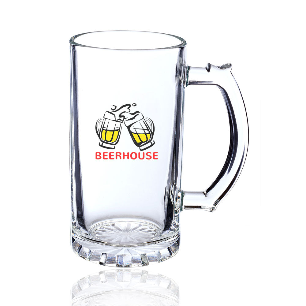 Imported Clear Wholesale Printed Sports Beer Mugs. Highest standard glass material. Thick, Star-bottom beer mug with Thumb grip handle.